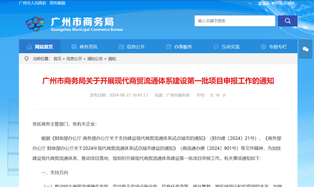 根據《財政部辦公廳 商務部辦公廳關于支持建設現代商貿流通體系試點城市的通知》(財辦建〔2024〕21號)、《商務部辦公廳 財政部辦公廳關于2024年現代商貿流通體系試點城市建設的通知》(商流通辦便〔2024〕901號)等文件精神,為加快建設現代商貿流通體系,推動項目落地,現組織開展現代商貿流通體系建設第一批項目申報工作。有關事項通知如下: